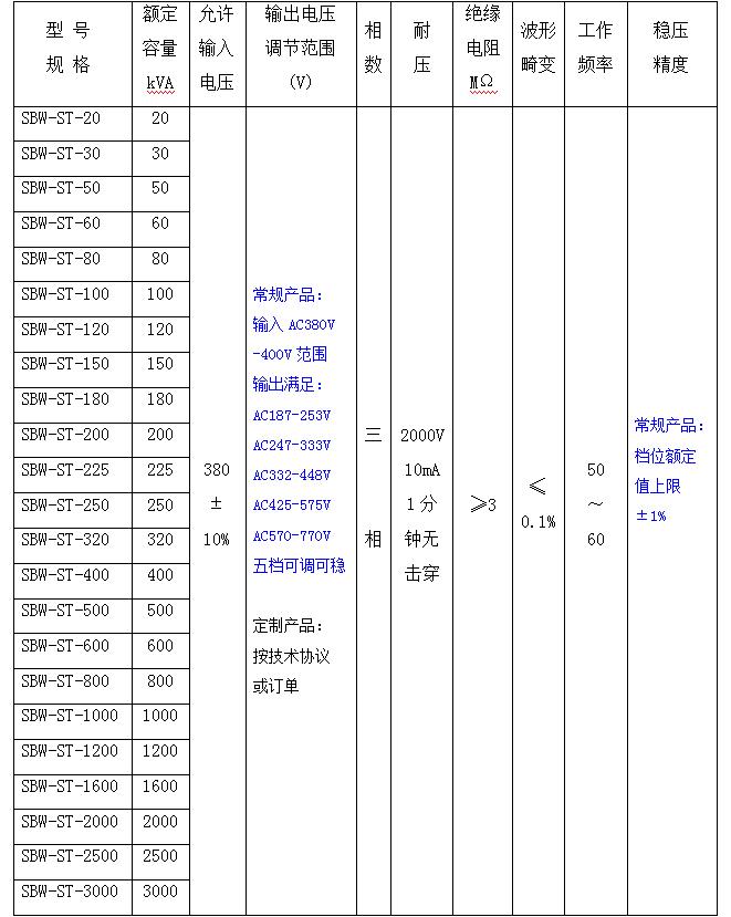 SBW-ST系列調(diào)壓穩(wěn)壓器參數(shù)指標(biāo):所有參數(shù)皆可按需定制,以下常規(guī)僅供參考~